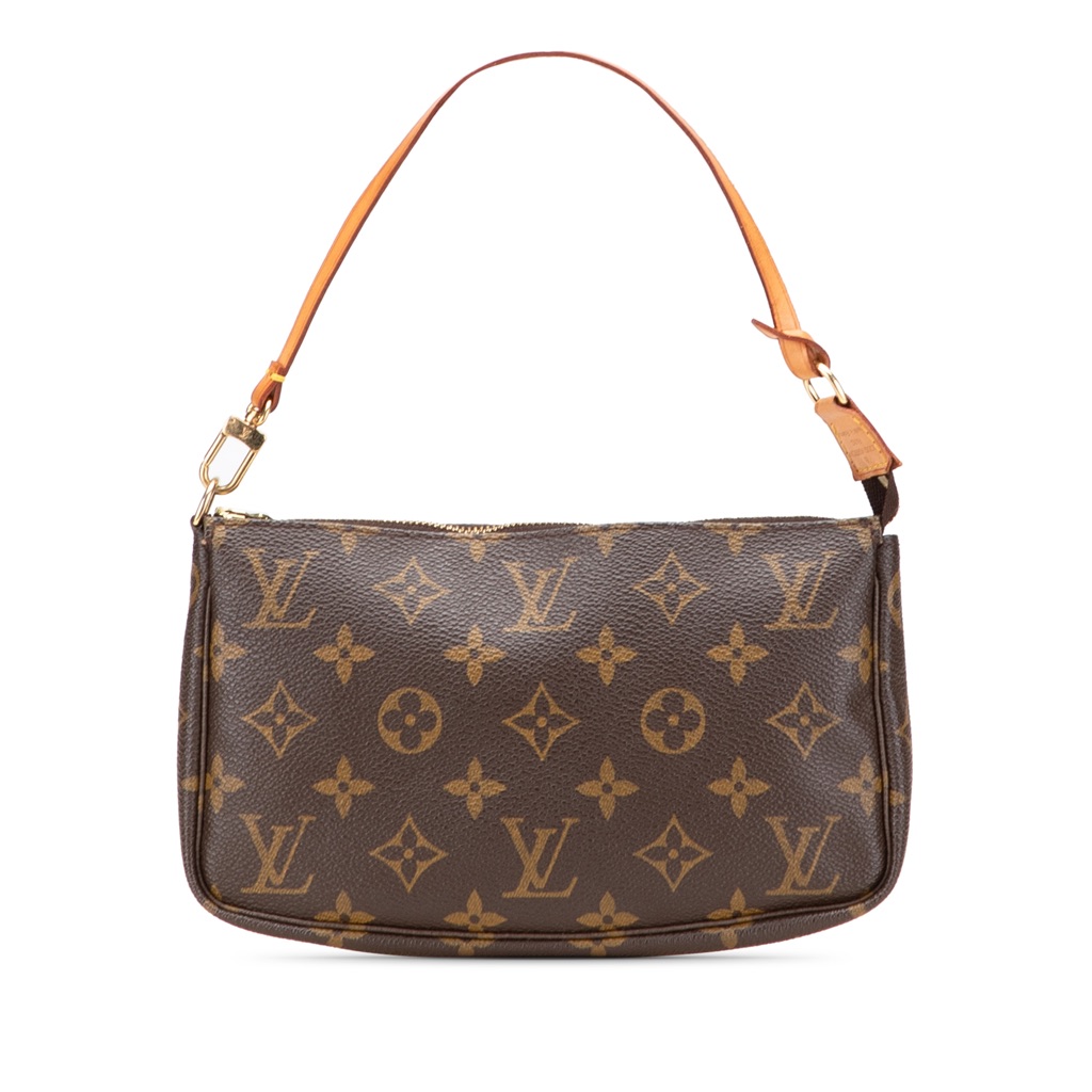 The Pochette Accessoires features a monogram canvas body, a flat vachetta leather handle, and a top zip closure.