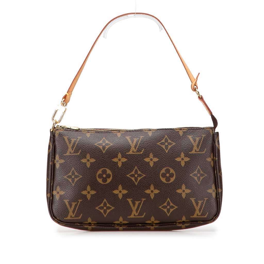 The Pochette Accessoires features a monogram canvas body, a flat vachetta leather strap, and a top zip closure.