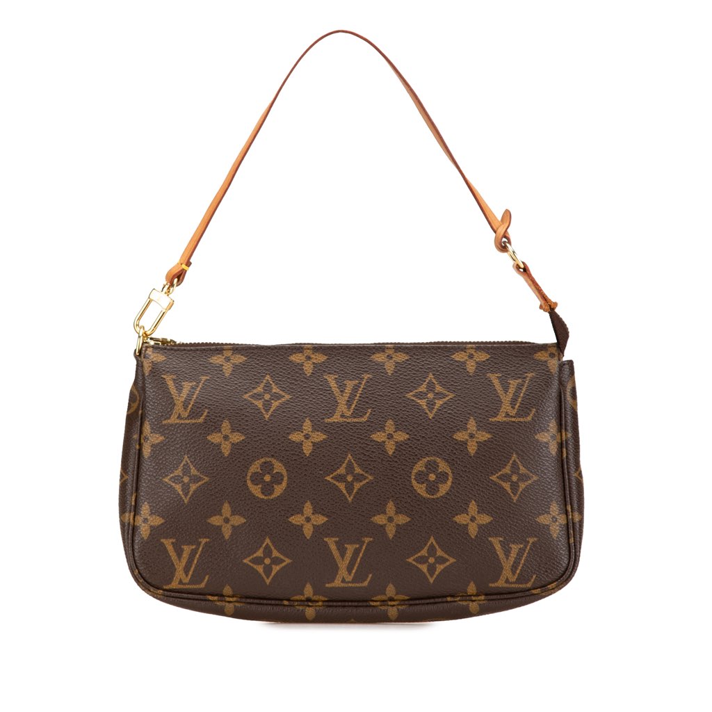 The Pochette Accessoires features a monogram canvas body, a flat vachetta leather handle, and a top zip closure.
