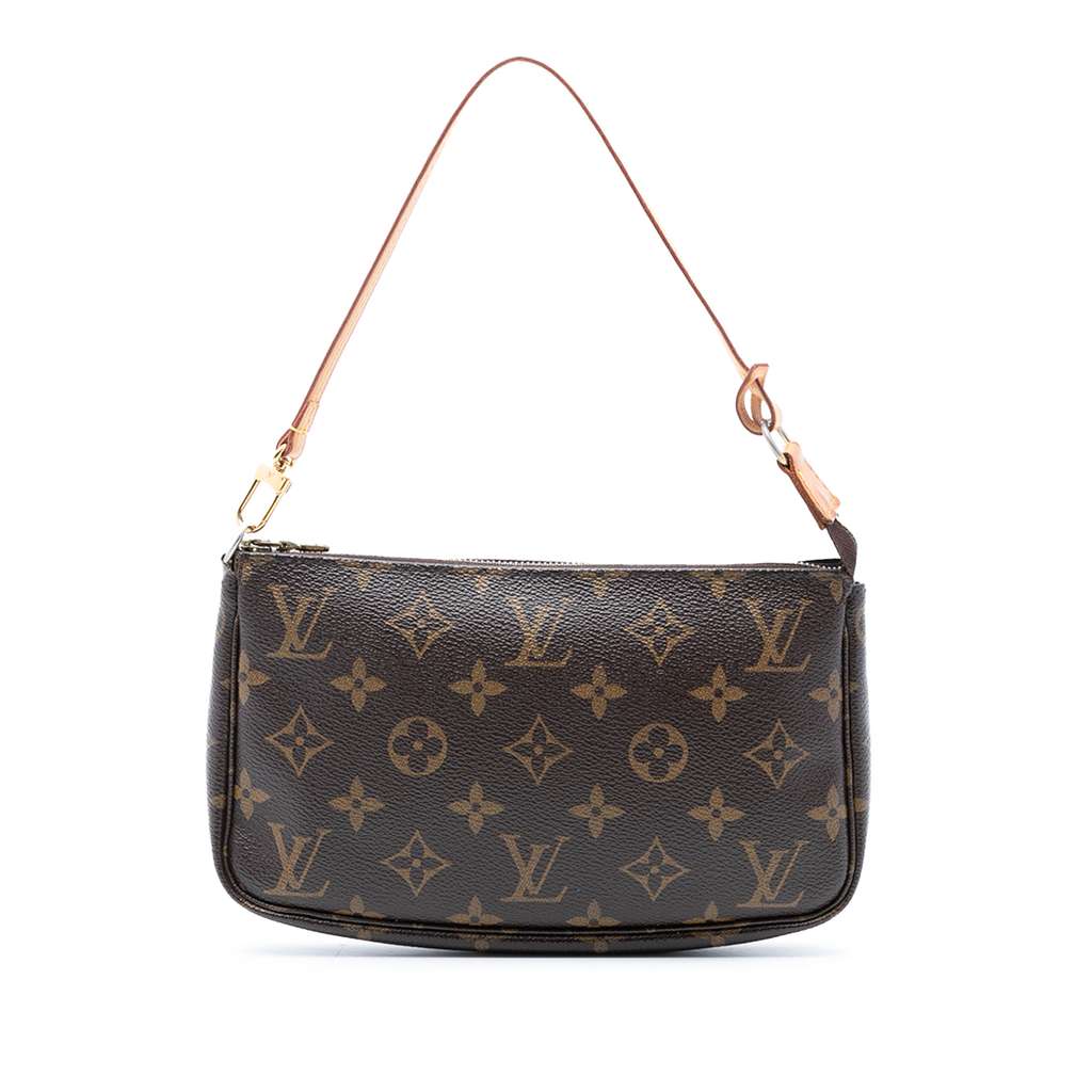 The Pochette Accessoires features a monogram canvas body, a flat vachetta leather handle, and a top zip closure.