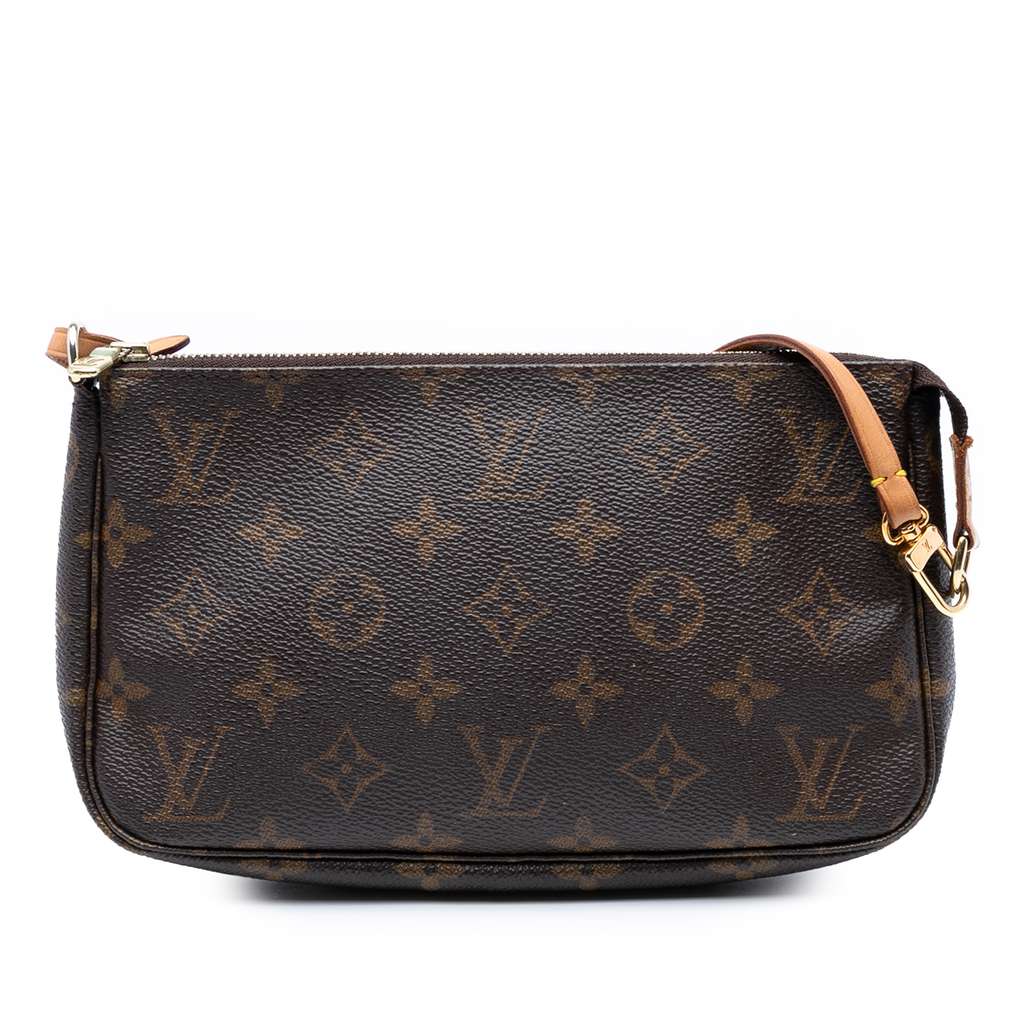 The Pochette Accessoires features a monogram canvas body, a flat vachetta leather strap, and a top zip closure.