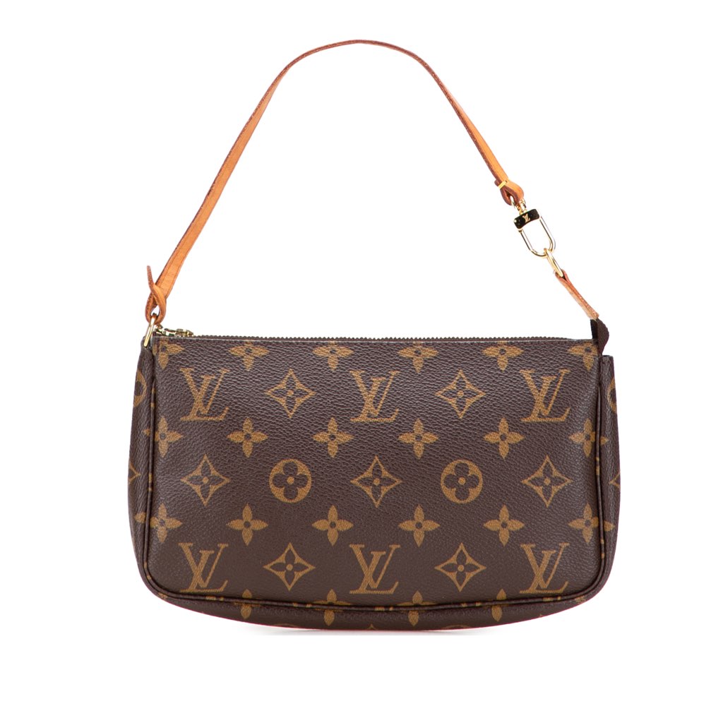 The Pochette Accessoires features a monogram canvas body, a flat vachetta leather handle, and a top zip closure.