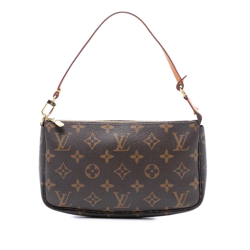 The Pochette Accessoires features a monogram canvas body, a flat vachetta leather handle, and a top zip closure.
