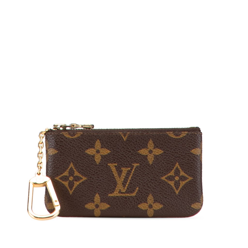 This coin pouch features a monogram canvas body and a top zip closure.