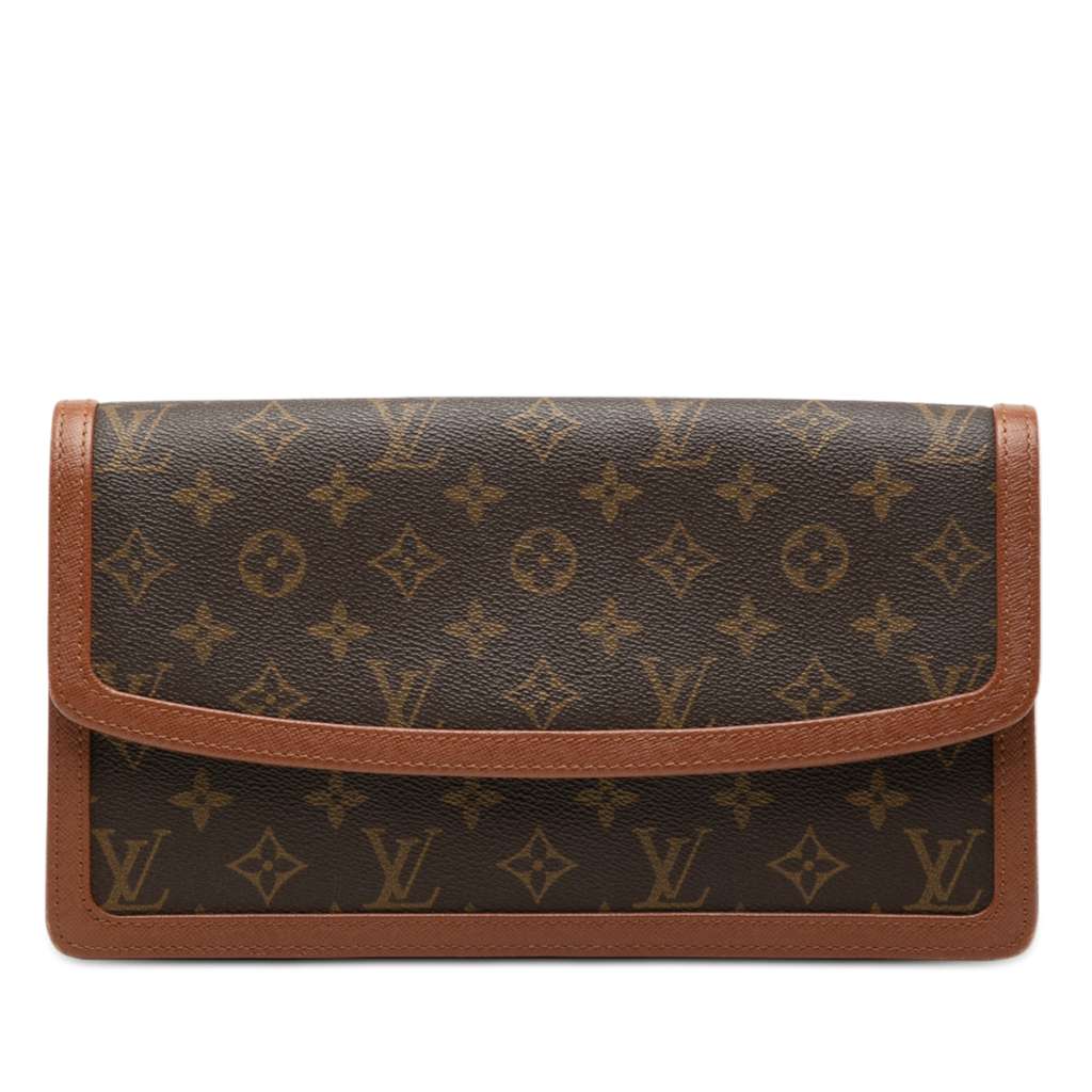 The Pochette Dame features a monogram canvas body with a leather trim, a front flap with a snap closure, and interior zip and slip pockets.