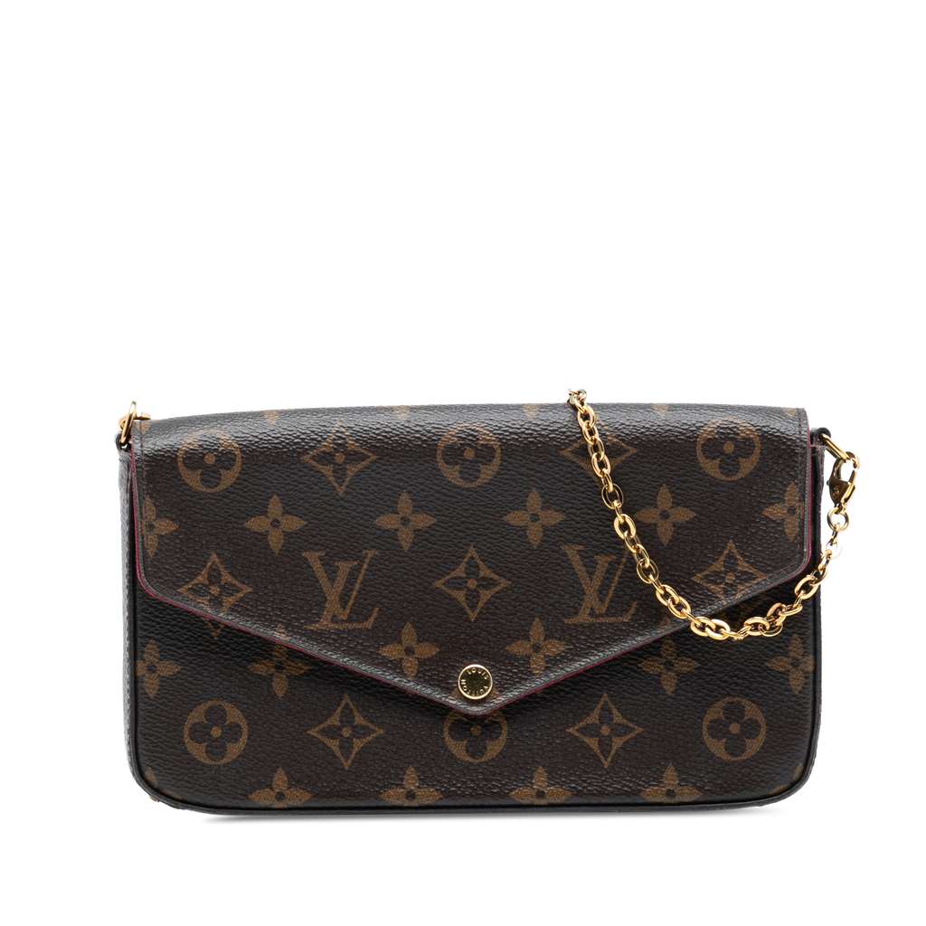 The Pochette Felicie crossbody bag features a monogram canvas body, a detachable gold-tone chain shoulder strap, a top flap with snap closure, and an interior slip pocket.