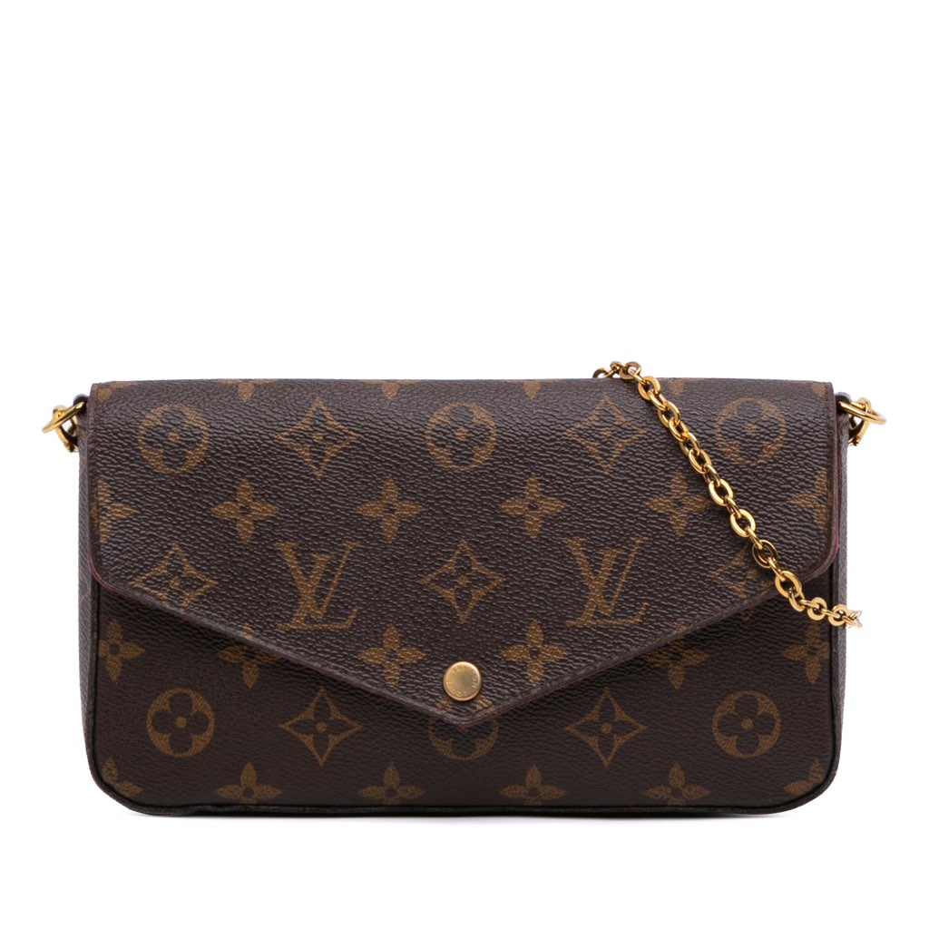 The Pochette Felicie crossbody bag features a monogram canvas body, a detachable gold-tone chain link shoulder strap, a top flap with snap closure, a pouch inclusion, and an interior slip pocket.