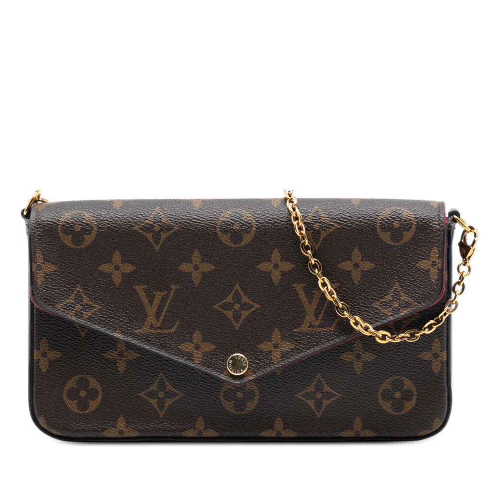 The Pochette Felicie crossbody bag features a monogram canvas body, a detachable gold-tone chain shoulder strap, a top flap with snap closure, and an interior slip pocket.