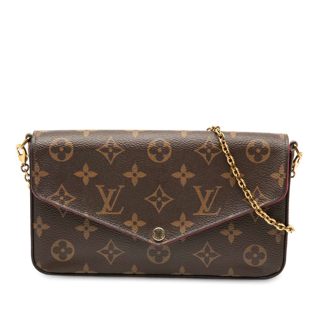 The Pochette Felicie crossbody bag features a monogram canvas body, a detachable gold-tone chain shoulder strap, a top flap with snap closure, an interior slip pocket, and pouch inclusions.