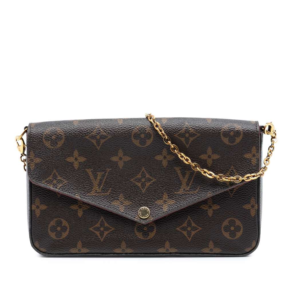 The Pochette Felicie crossbody bag features a monogram canvas body, a detachable gold-tone chain shoulder strap, a top flap with snap closure, an interior slip pocket, and a pouch inclusion.