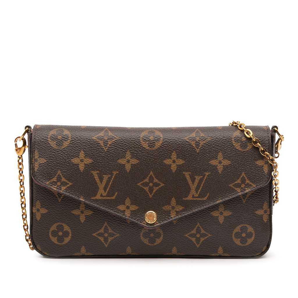 The Pochette Felicie crossbody bag features a monogram canvas body, a detachable gold-tone chain link shoulder strap, a top flap with snap closure, an interior slip pocket, and pouch inclusions.