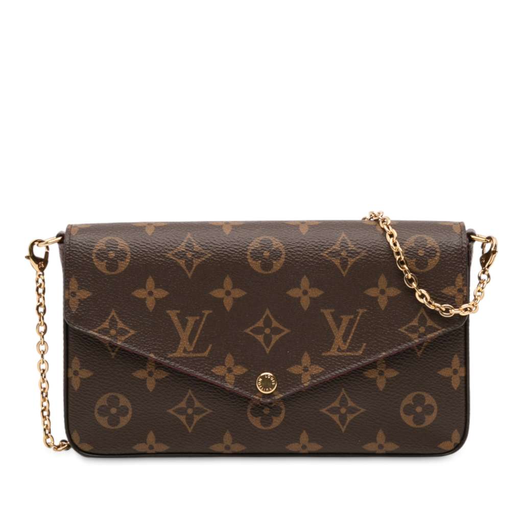 The Pochette Felicie features a monogram canvas body, a detachable gold-tone chain shoulder strap, a top flap with snap closure, an interior slip pocket, and pouch inclusions.