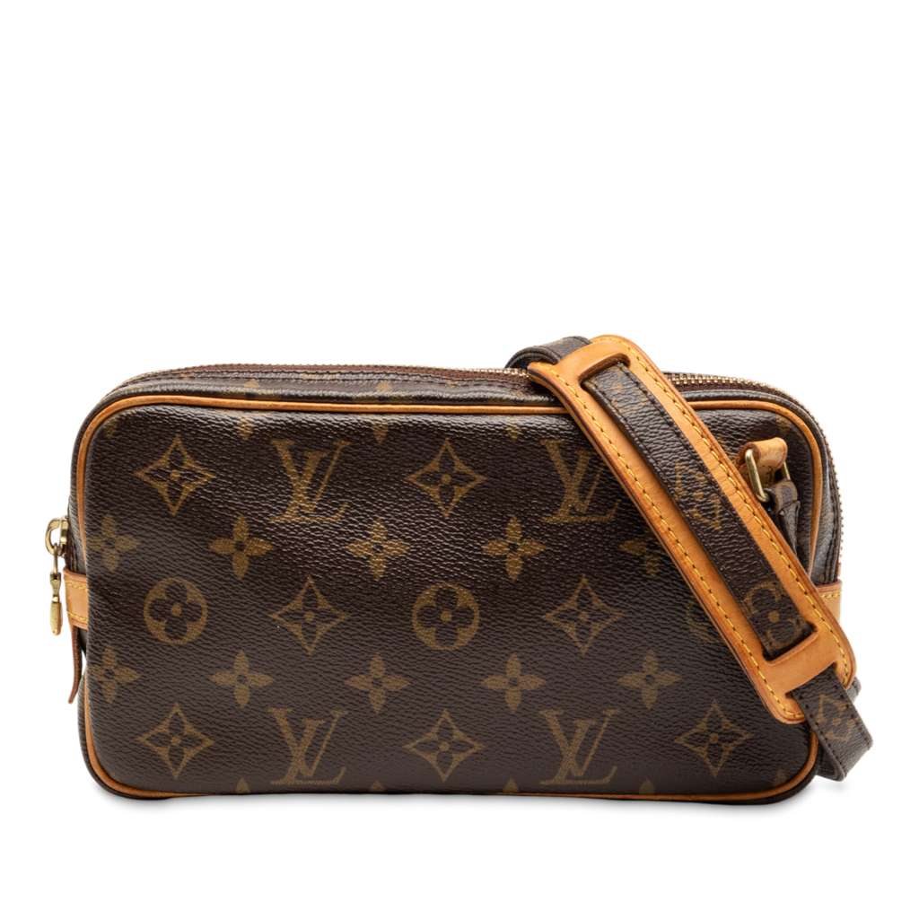 The Marly Bandouliere features a monogram canvas body, an adjustable shoulder strap, and a top zip closure.