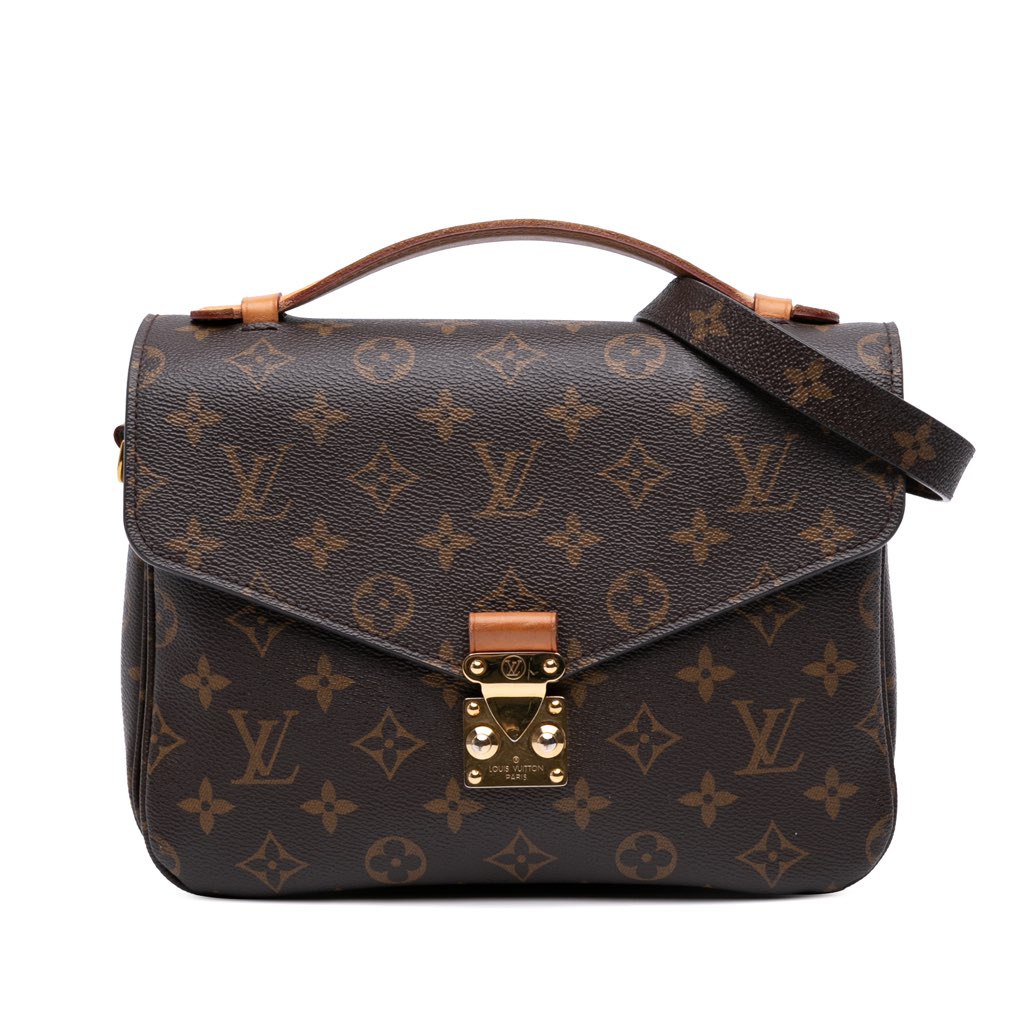 The Pochette Metis features a monogram canvas body, a flat vachetta leather top handle, a detachable flat shoulder strap, a front flap with an S-lock closure, an exterior zip pocket, and interior slip pockets.