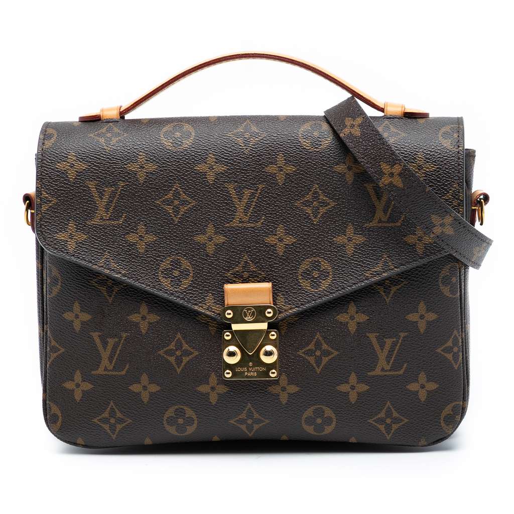 The Pochette Metis features a monogram canvas body, a flat vachetta leather top handle, a detachable flat shoulder strap, a front flap with an S-lock closure, an exterior back zip pocket, and an interior slip pocket.