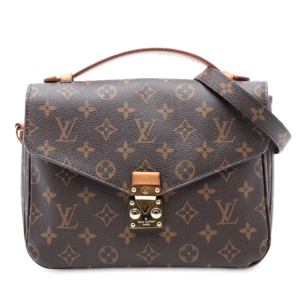 The Pochette Metis features a monogram canvas body, a flat vachetta leather top handle, a detachable flat shoulder strap, a front flap with an S-lock closure, an exterior zip pocket, and interior slip pockets.