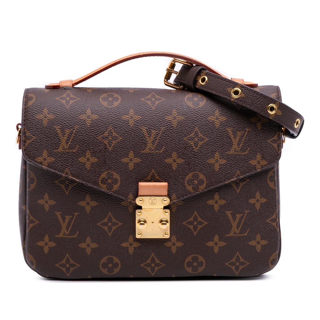 The Pochette Metis features a monogram canvas body, a flat vachetta leather top handle, a detachable flat shoulder strap, a front flap with an S-lock closure, an exterior zip pocket, and interior slip pockets.