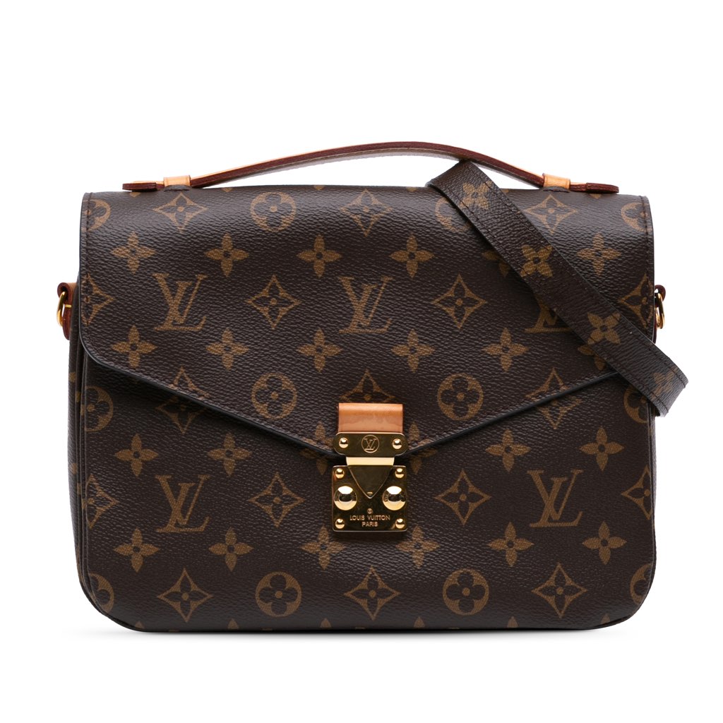 The Pochette Metis features a monogram canvas body, a flat vachetta leather top handle, a detachable flat shoulder strap, a front flap with an S-lock closure, an exterior zip pocket, and interior slip pockets.