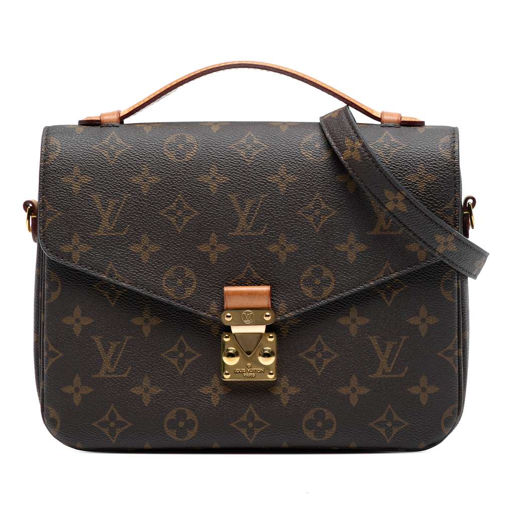 The Pochette Metis features a monogram canvas body, a flat vachetta leather top handle, a detachable flat shoulder strap, a front flap with an S-lock closure, an exterior zip pocket, and interior slip pockets.