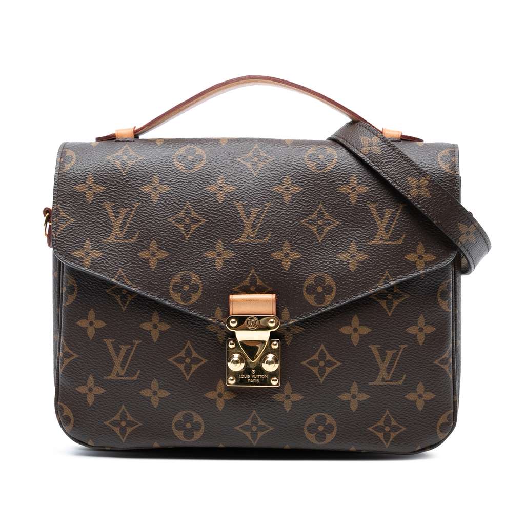The Pochette Metis features a monogram canvas body, a flat vachetta leather top handle, a detachable flat shoulder strap, a front flap with an S-lock closure, an exterior back zip pocket, and interior slip pockets.