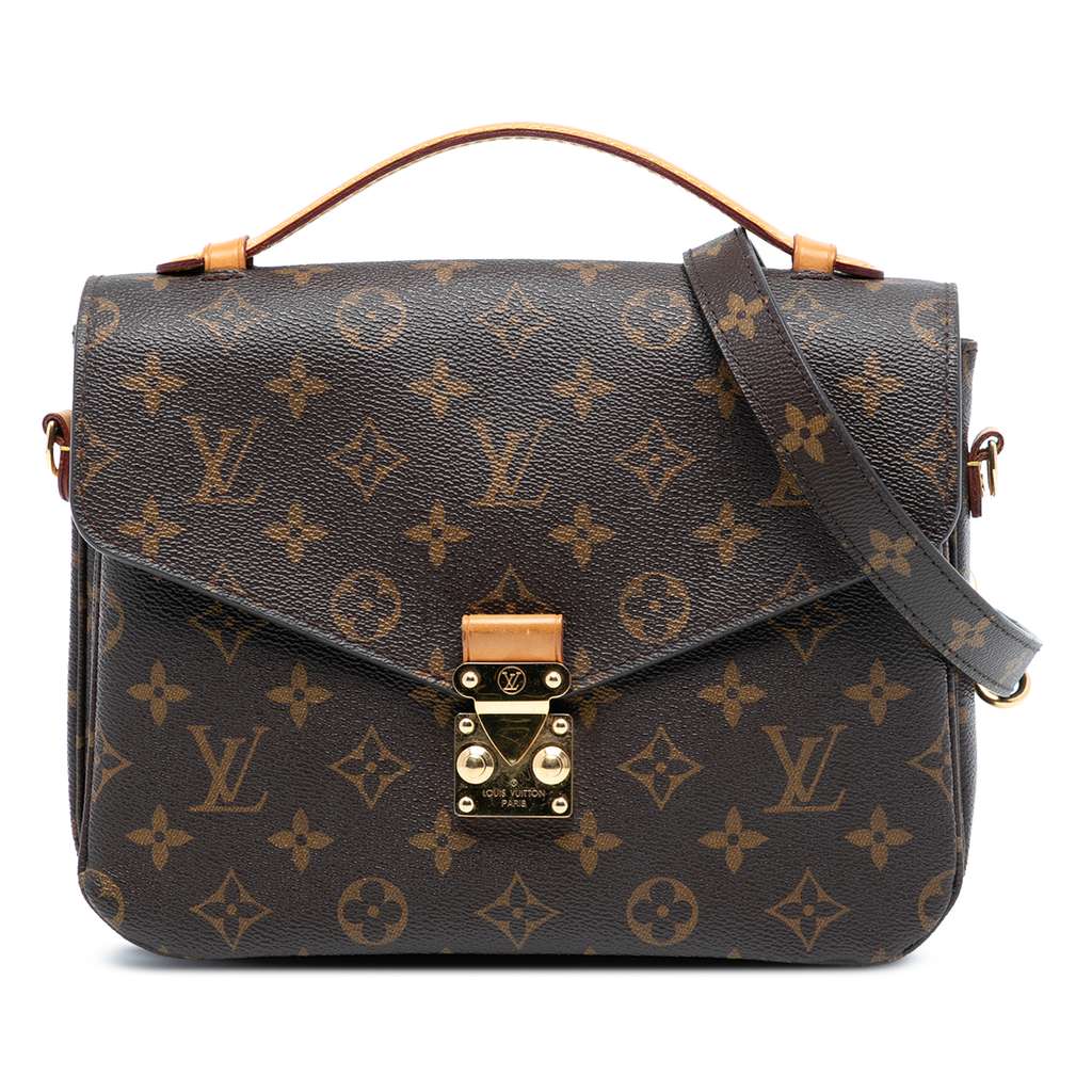 The Pochette Metis features a monogram canvas body, a flat vachetta leather top handle, a detachable flat shoulder strap, a front flap with an S-lock closure, an exterior zip pocket, and interior slip pockets.