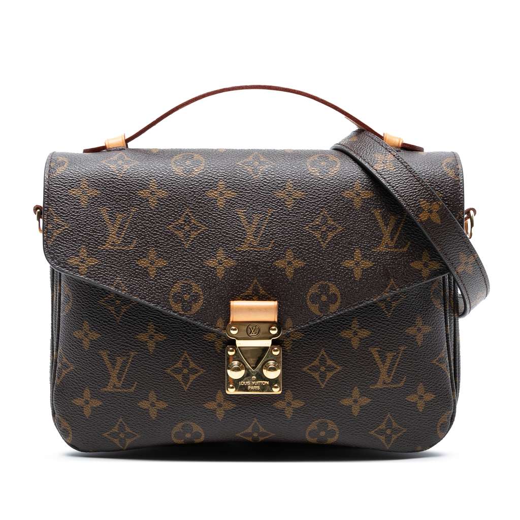 The Pochette Metis features a monogram canvas body, a flat vachetta leather top handle, a detachable flat shoulder strap, a front flap with an S-lock closure, an exterior zip pocket, and interior slip pockets.