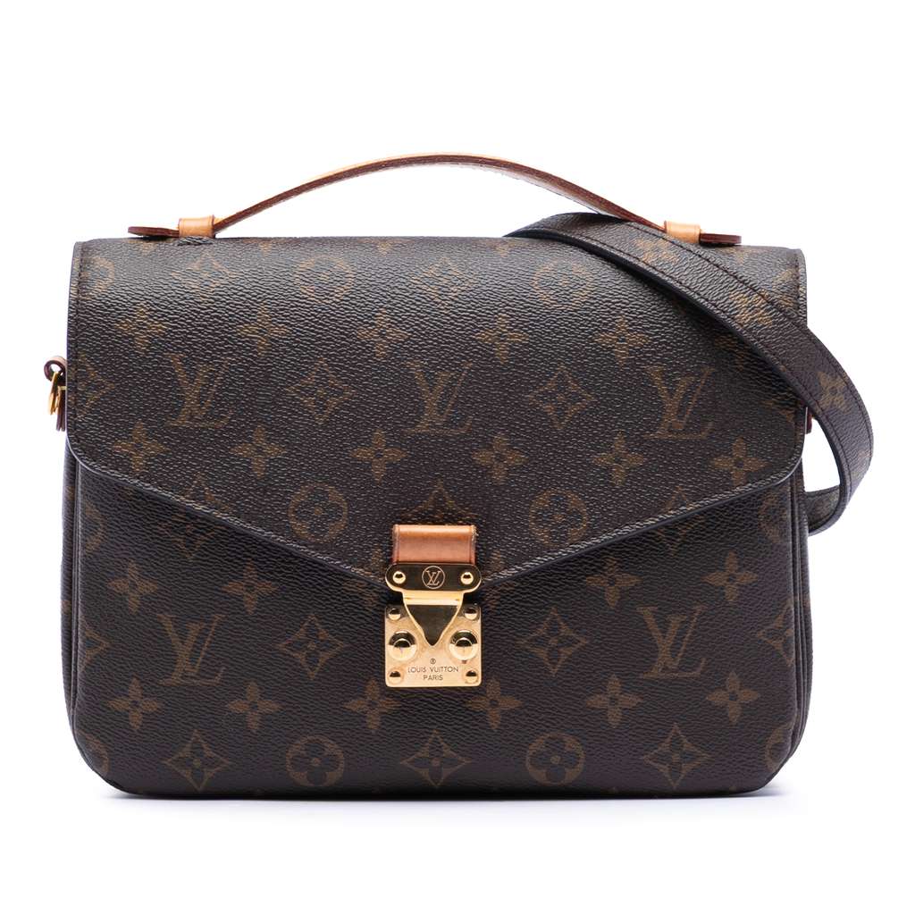 The Pochette Metis features a monogram canvas body, a flat vachetta leather top handle, a detachable flat shoulder strap, a front flap with an S-lock closure, an exterior zip pocket, and interior slip pockets.