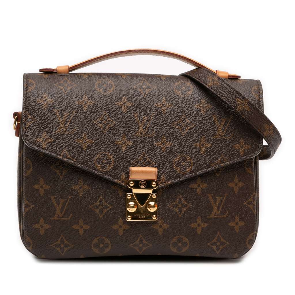 The Pochette Metis features a monogram canvas body, a flat vachetta leather top handle, a detachable flat shoulder strap, a front flap with an S-lock closure, an exterior zip pocket, and interior slip pockets.