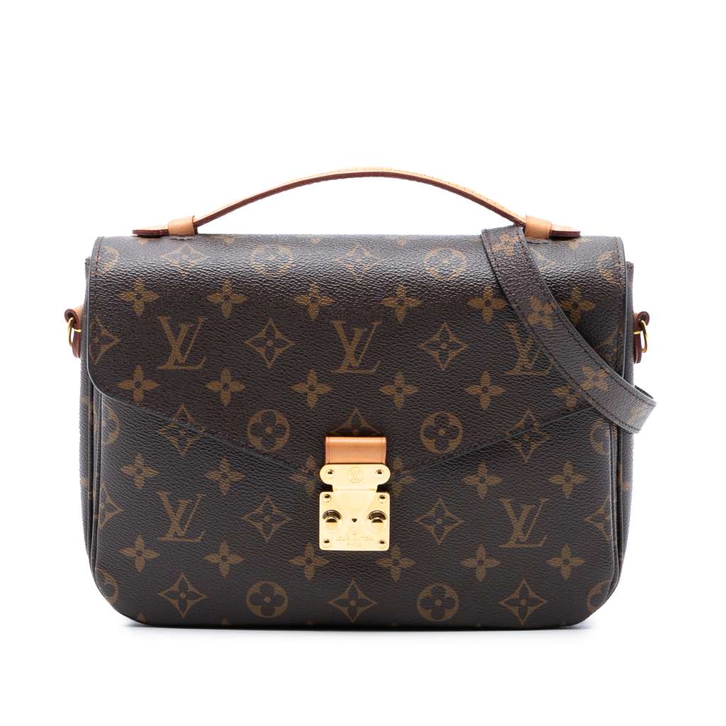 The Pochette Metis features a monogram canvas body, a flat vachetta leather top handle, a detachable flat shoulder strap, a front flap with an S-lock closure, an exterior zip pocket, and interior slip pockets.