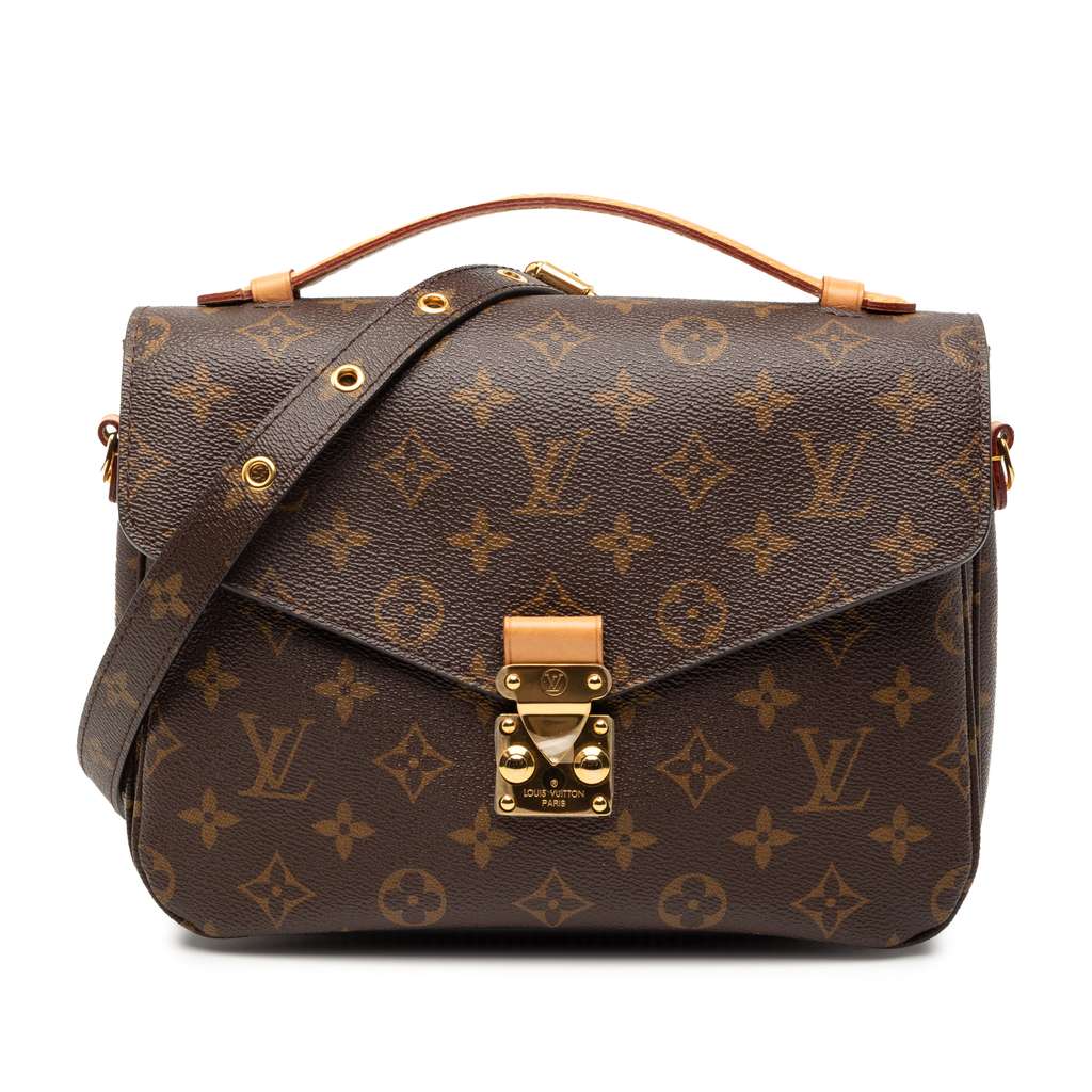 The Pochette Metis features a monogram canvas body, a flat vachetta leather top handle, a detachable flat shoulder strap, a front flap with an S-lock closure, an exterior back zip pocket, and interior slip pockets.