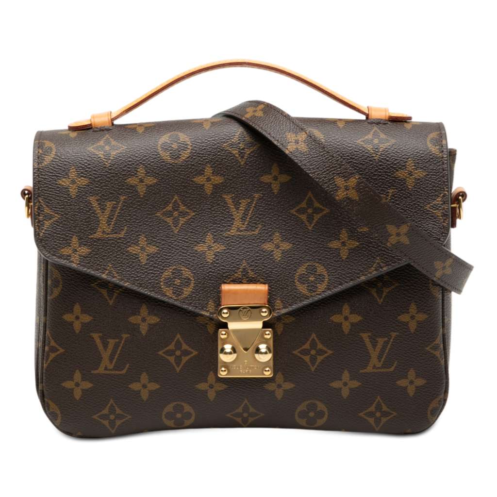The Pochette Metis features a monogram canvas body, a flat vachetta leather top handle, a detachable flat shoulder strap, a front flap with an S-lock closure, an exterior zip pocket, and interior slip pockets.