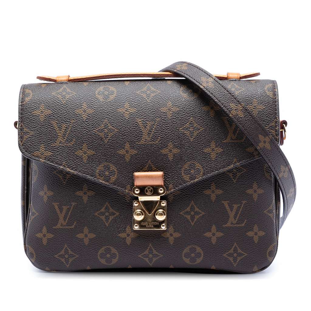 The Pochette Metis features a monogram canvas body, a flat vachetta leather top handle, a detachable flat shoulder strap, a front flap with an S-lock closure, an exterior zip pocket, and interior slip pockets.