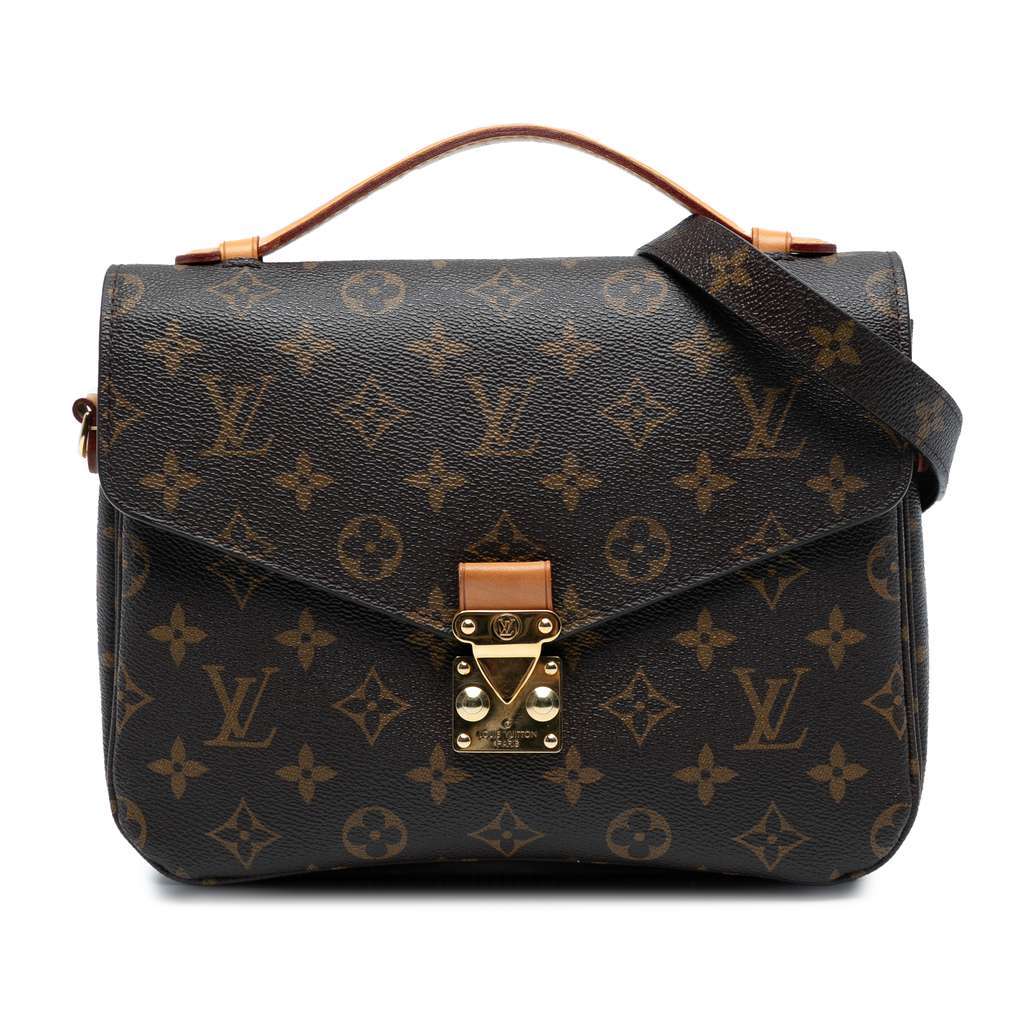 The Pochette Metis features a monogram canvas body, a flat vachetta leather top handle, a detachable flat shoulder strap, a front flap with an S-lock closure, an exterior zip pocket, and interior slip pockets.