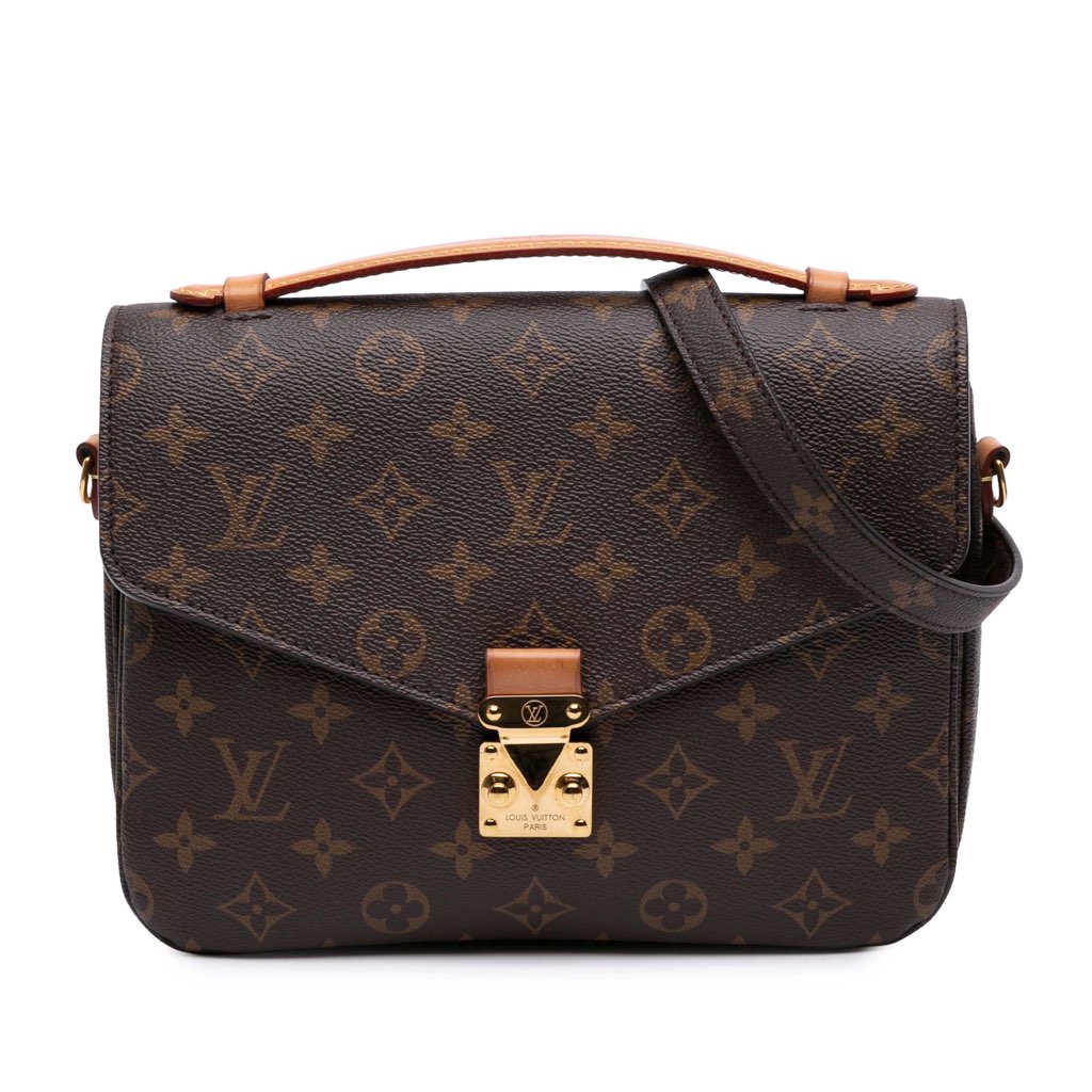 The Pochette Metis features a monogram canvas body, a flat vachetta leather top handle, a detachable flat shoulder strap, a front flap with an S-lock closure, an exterior zip pocket, and interior slip pockets.