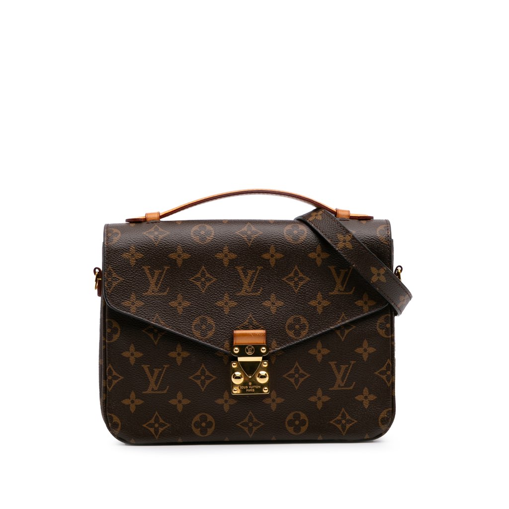 The Pochette Metis features a monogram canvas body, a flat vachetta leather top handle, a detachable flat shoulder strap, a front flap with an S-lock closure, an exterior zip pocket, and interior slip pockets.