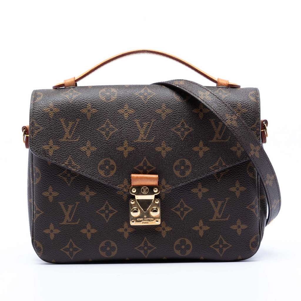 The Pochette Metis features a monogram canvas body, a flat vachetta leather top handle, a detachable and adjustable flat shoulder strap, a front flap with an S-lock closure, an exterior back zip pocket, and interior slip pockets.