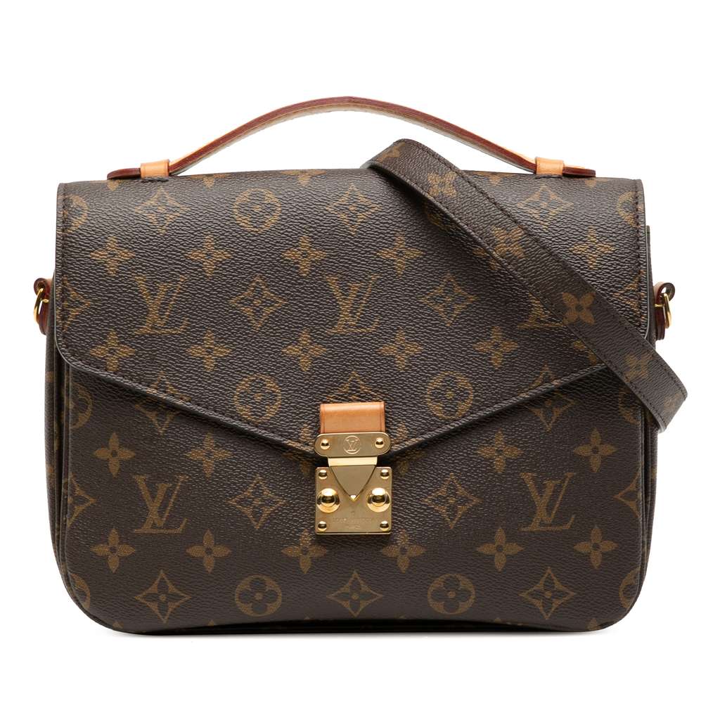 The Pochette Metis features a monogram canvas body, a flat vachetta leather top handle, a detachable and adjustable e flat shoulder strap, a front flap with an S-lock closure, an exterior zip pocket, and interior slip pockets.