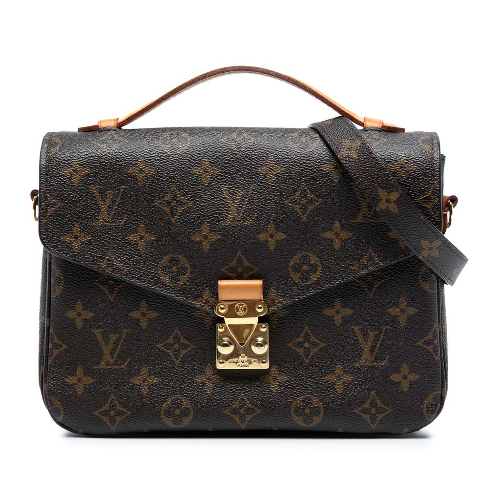 The Pochette Metis features a monogram canvas body, a flat vachetta leather top handle, a detachable flat shoulder strap, a front flap with an S-lock closure, an exterior zip pocket, and an interior slip pocket.