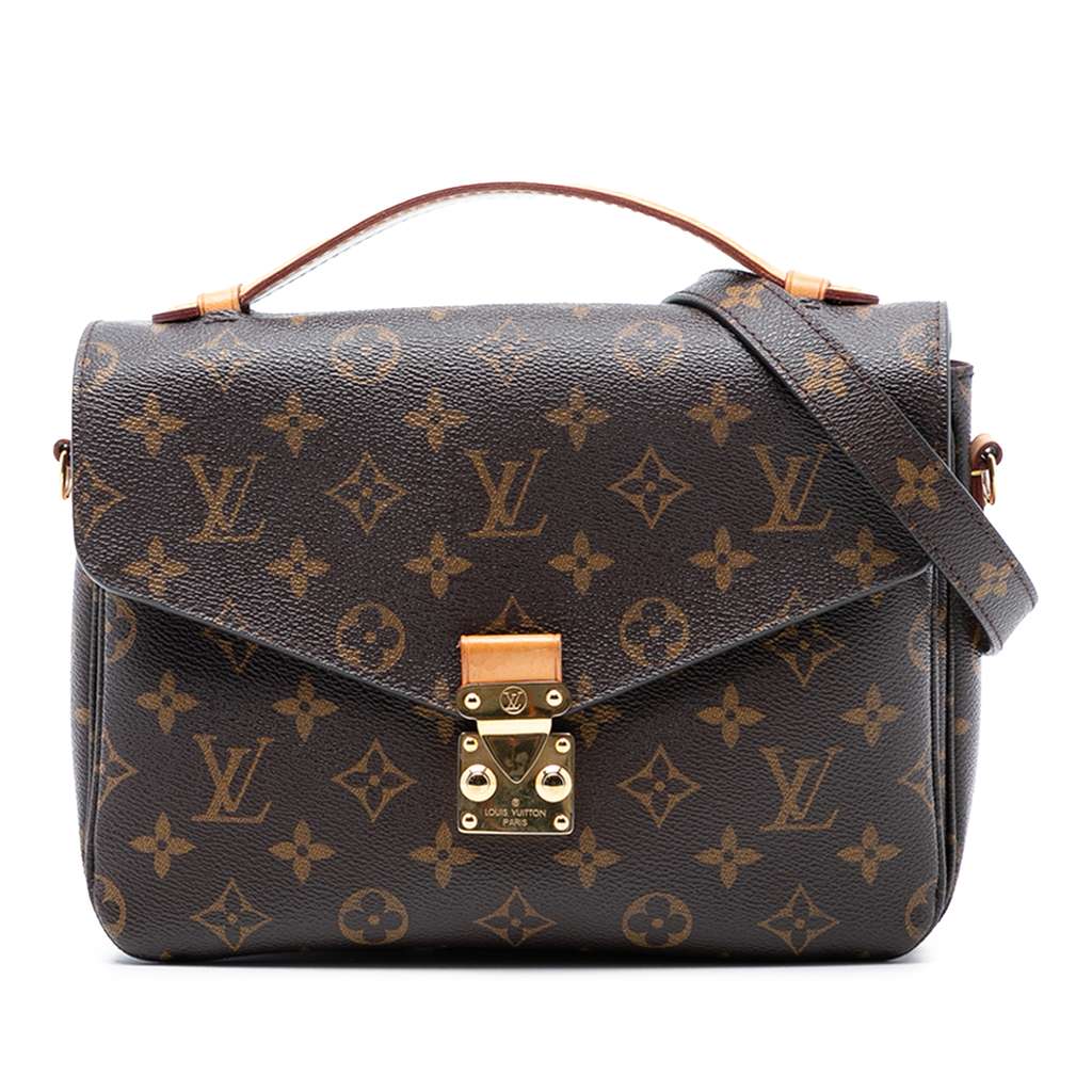 The Pochette Metis features a monogram canvas body, a flat vachetta leather top handle, a detachable flat shoulder strap, a front flap with an S-lock closure, an exterior back zip pocket, and an interior slip pocket.