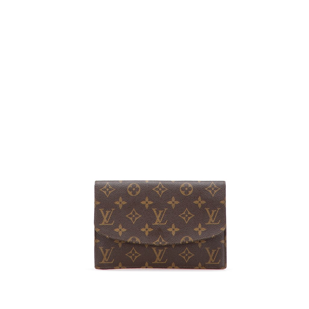 The Pochette Clutch 20 features a monogram canvas body, a front flap with snap closure, and a zip pocket.