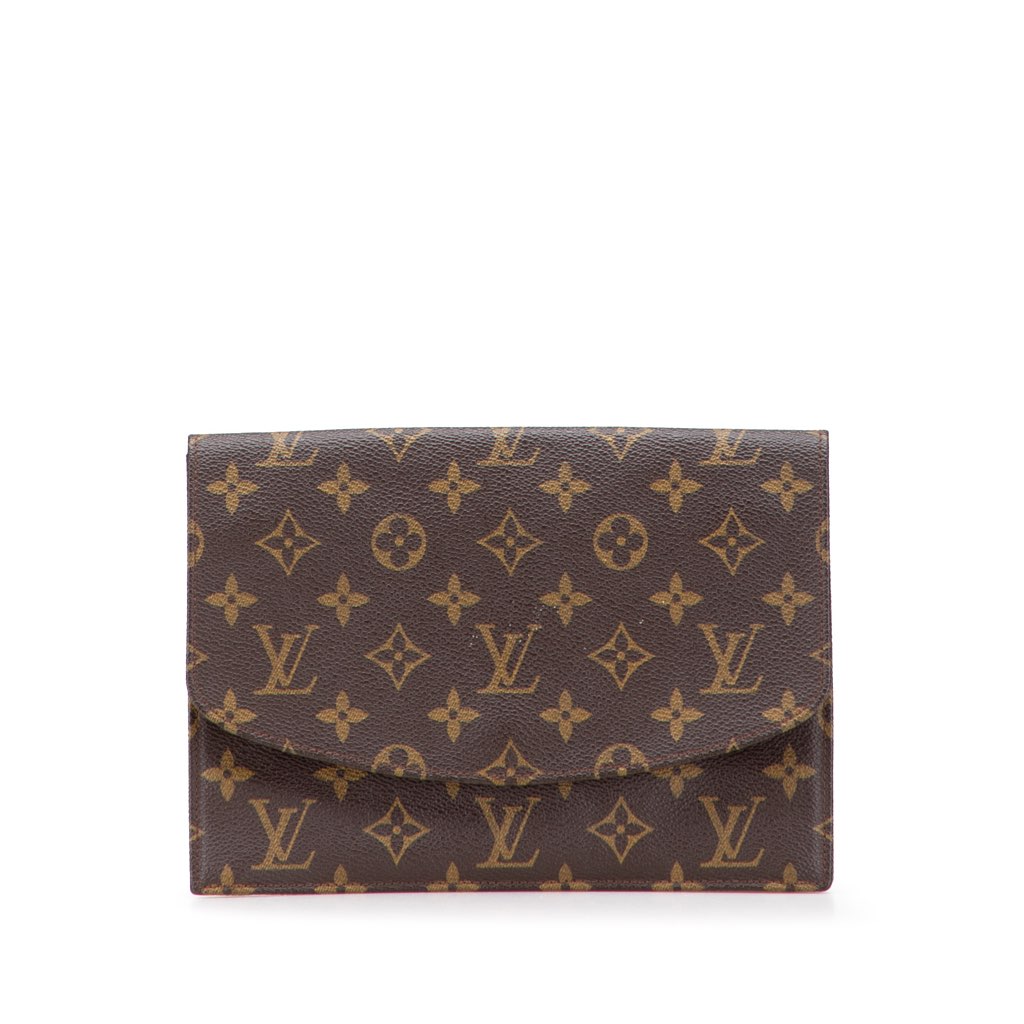 The Pochette Clutch 23 features a monogram canvas body and front flap.