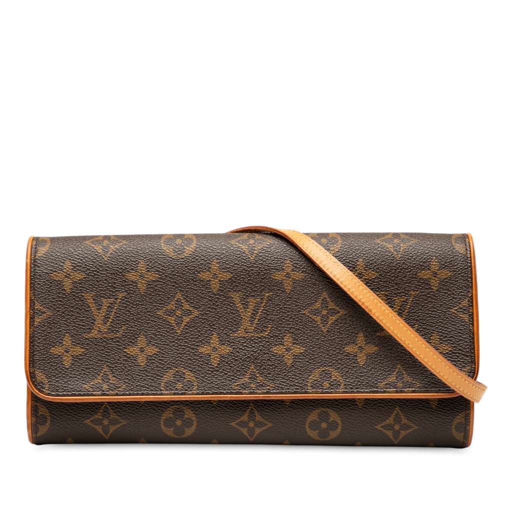 The Monogram Pochette Twin GM features a monogram canvas body, flat vachetta leather strap, and a front flap with magnetic snap closure