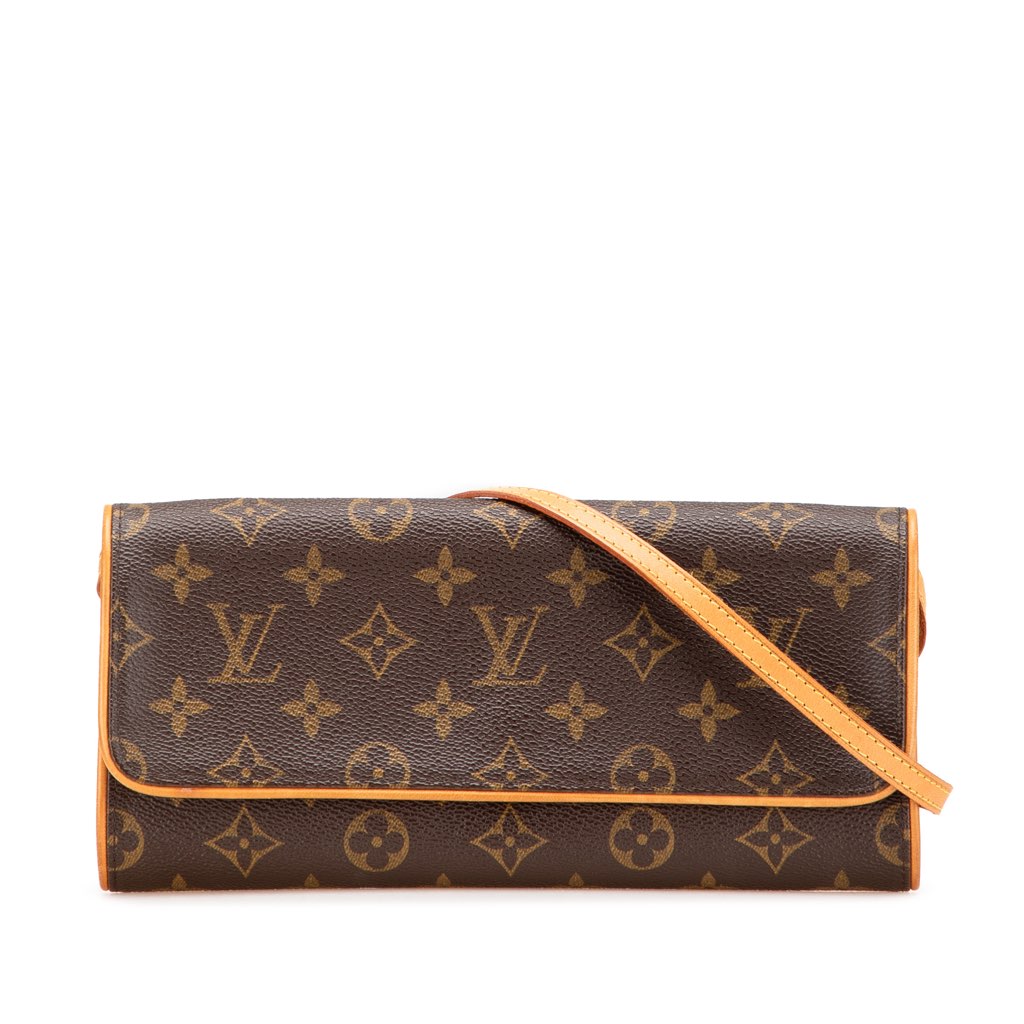 The Pochette Twin GM features a monogram canvas body with vachetta leather trim, a flat vachetta leather strap, a front flap with magnetic snap closure, and an interior slip pocket.
