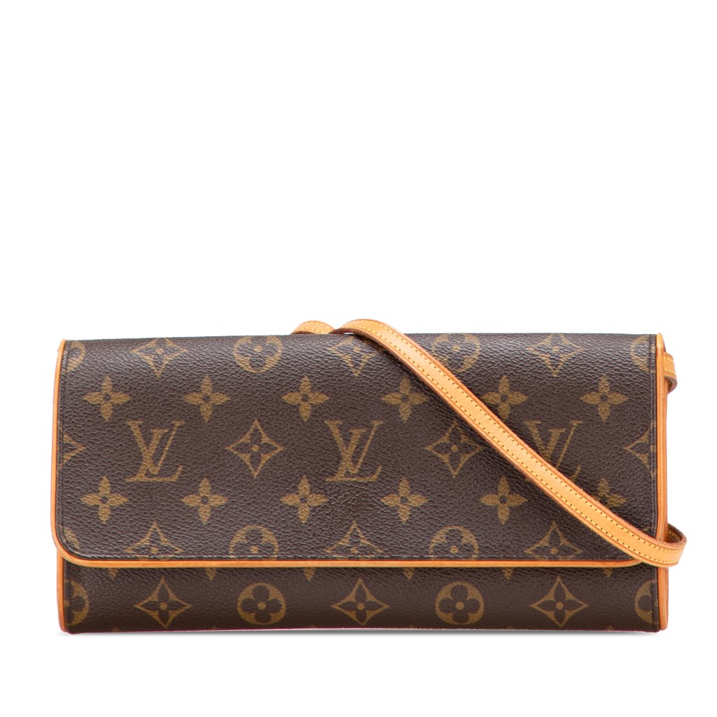 The Pochette Twin GM features a monogram canvas body with vachetta leather trim, a flat vachetta leather strap, a front flap with magnetic snap closure, and an interior slip pocket.