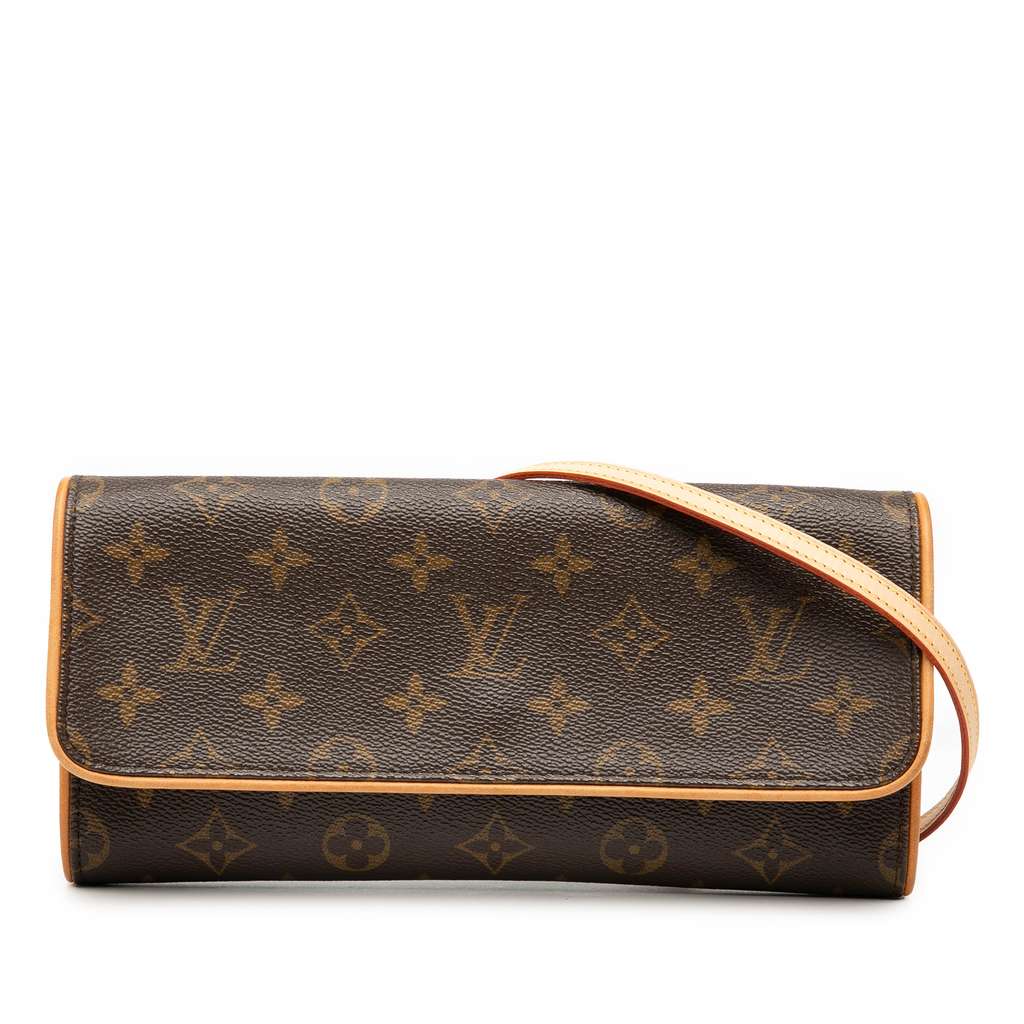 The Pochette Twin GM features a monogram canvas body with vachetta leather trim, a flat vachetta leather strap, a front flap with magnetic snap closure, and an interior slip pocket.