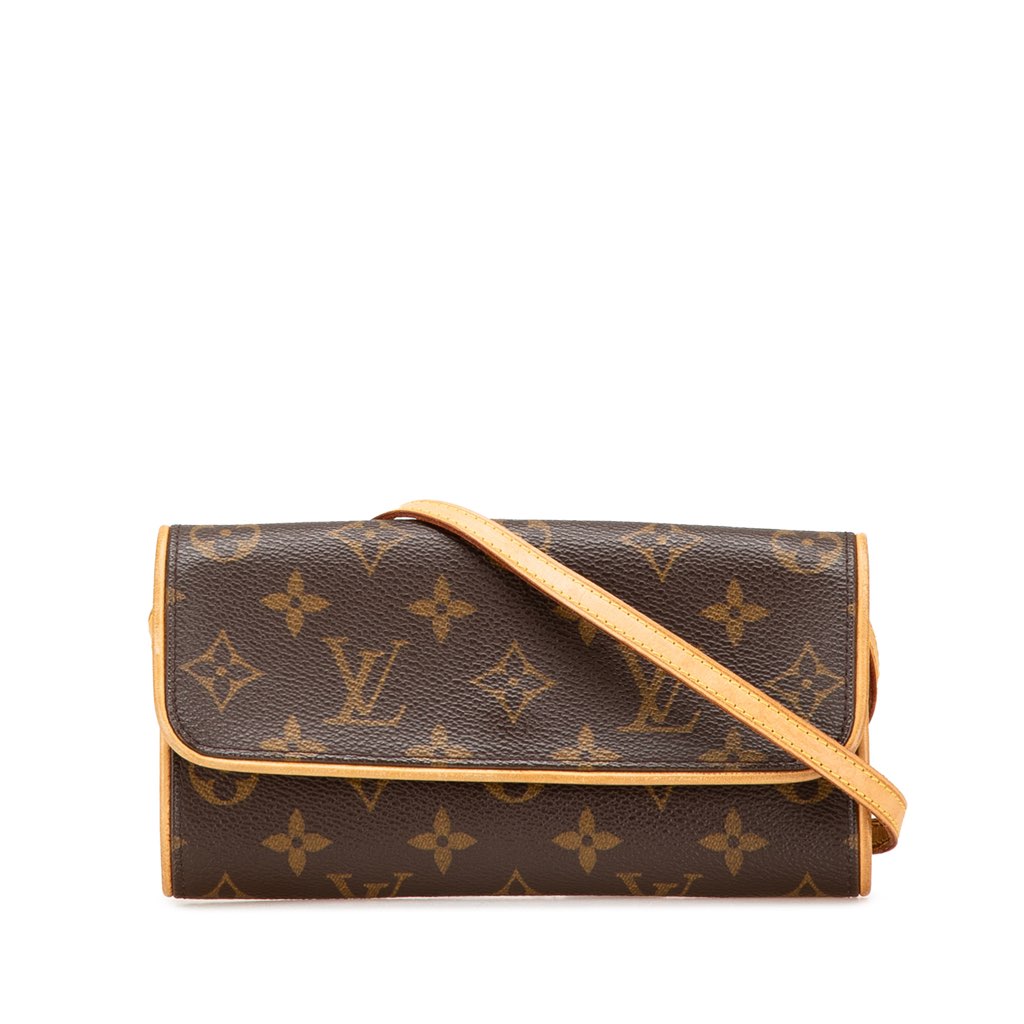 The Pochette Twin PM features a monogram canvas body with vachetta leather trim, a flat vachetta leather shoulder strap, and a front flap with magnetic snap closure.