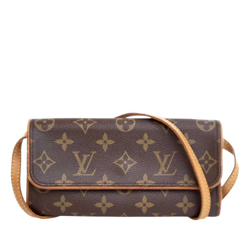 The Pochette Twin PM features a monogram canvas body with vachetta leather trim, a flat vachetta leather shoulder strap, and a front flap with a magnetic closure.