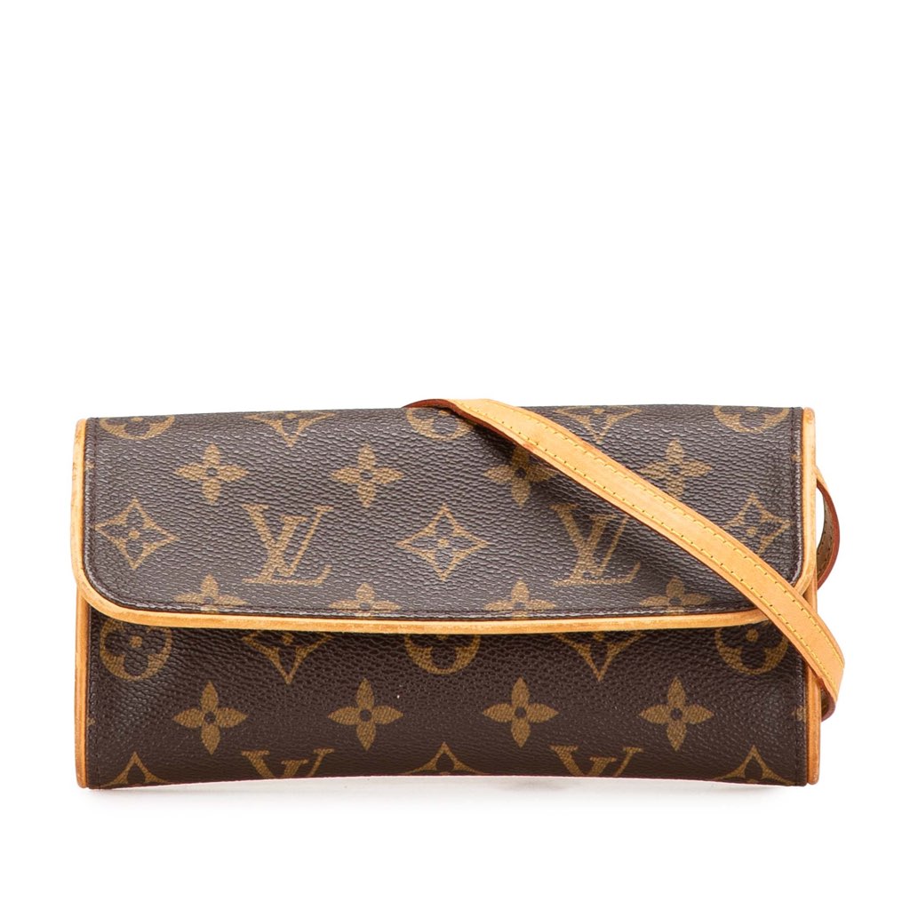 The Pochette Twin PM features a monogram canvas body with vachetta leather trim, a flat vachetta leather shoulder strap, and a front flap with magnetic snap closure.