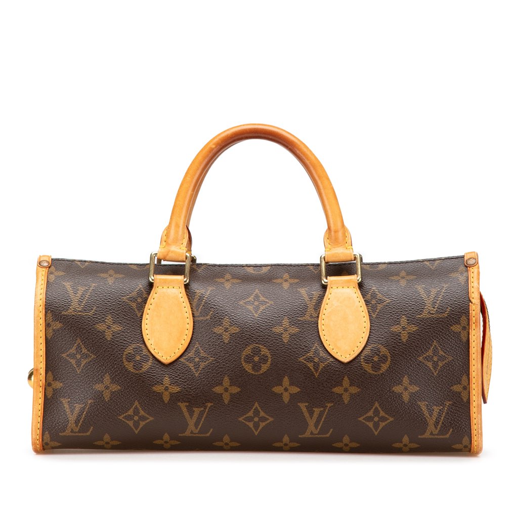 The Popincourt features a monogram canvas body, rolled vachetta leather handles, a top zip closure, and an interior slip pocket.