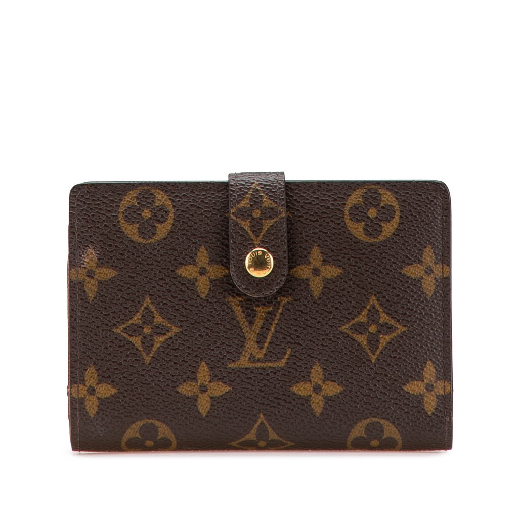 The Porte Monnaie Billets Viennois features a monogram canvas body, a top strap with a snap button closure, a back compartment with a kiss lock closure, and interior slip pockets.
